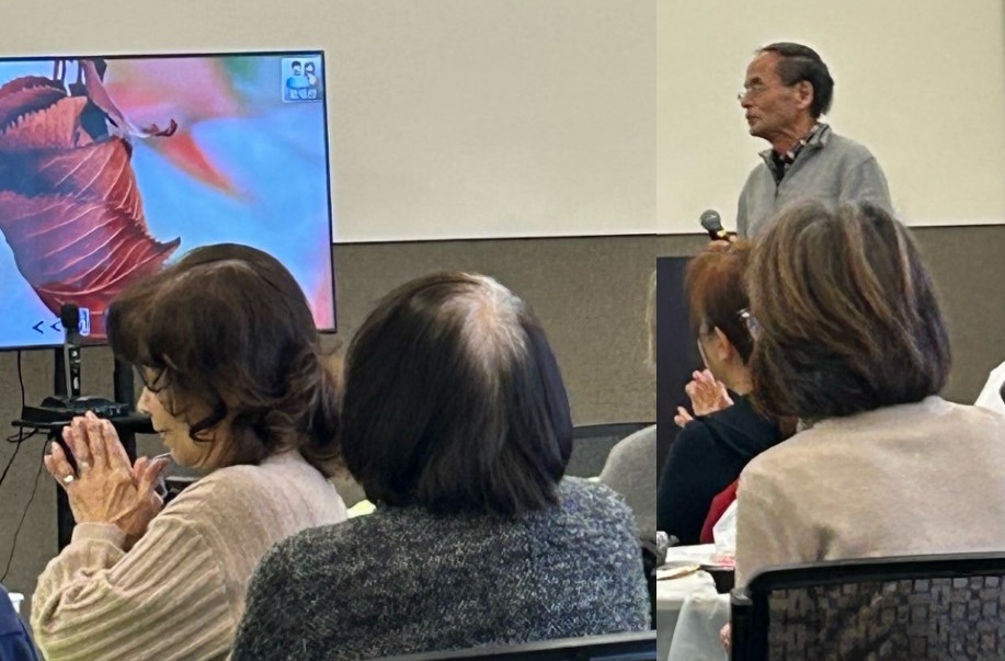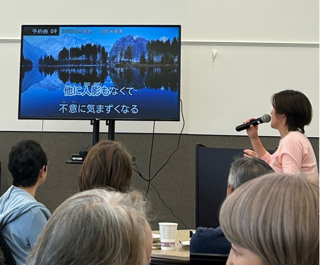今回の例会は初めての試みとしてカラオケの機械を使ってこの会の Music Director、 波多江美代子さんのリードで日本の唱歌、童謡、歌謡曲、演歌などをみんなで合唱する会で ♪上を向いて歩こう、♪浜辺の歌、♪おぼろ月夜、♪青い山脈、♪いい日旅立ち、等々 みんなで懐かしく口ずさむ会となりました。